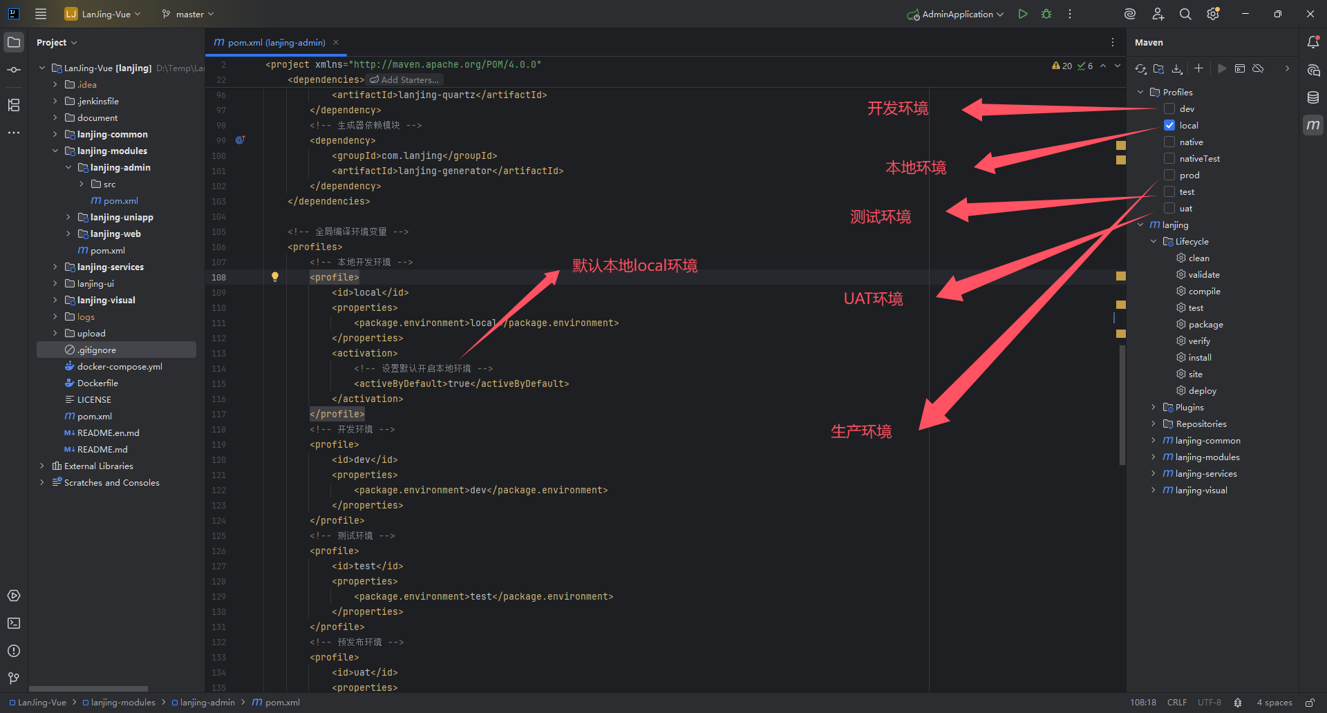本项目的启动模块是 lanjing-modules/lanjing-admin 模块,在模块的 POM 文件中定义了支持多种环境变量,包括 local、dev、test、uat、prod 等环境参数和变量。
