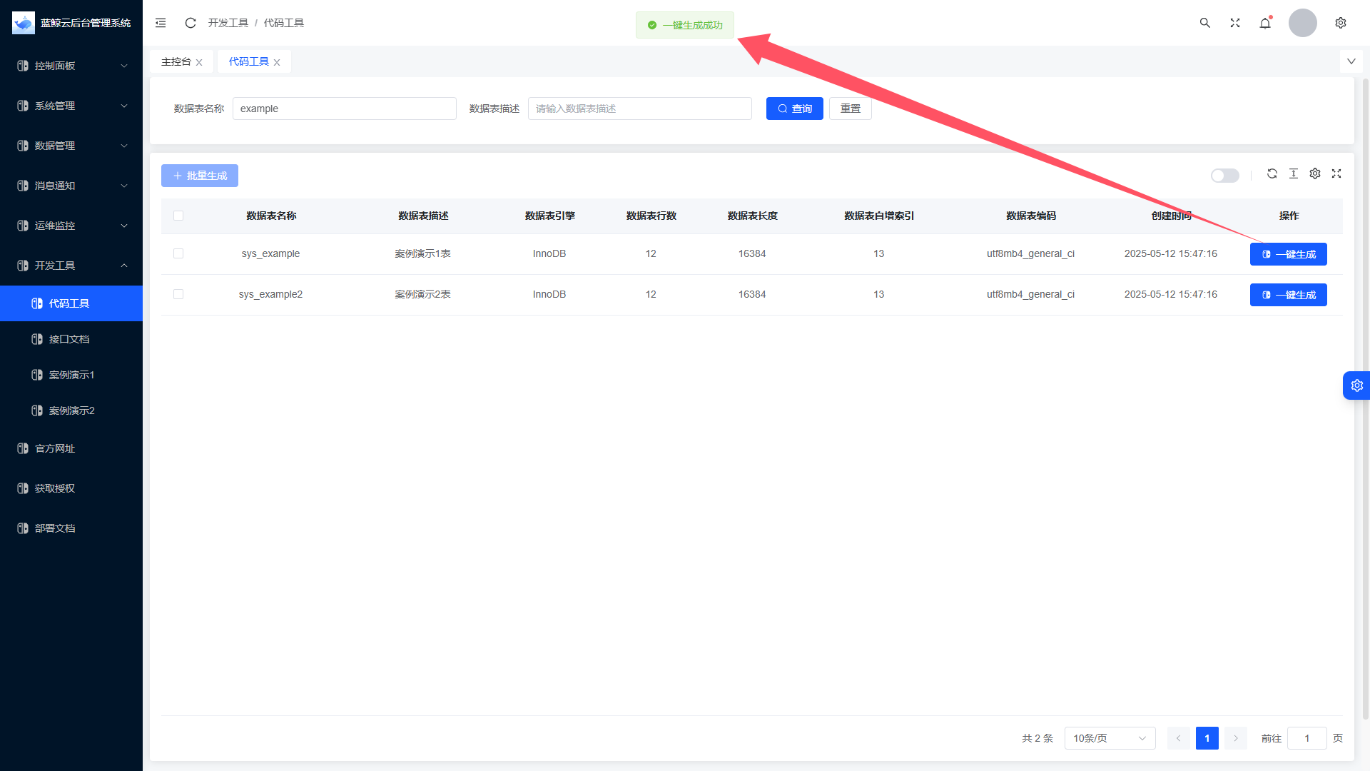 ) ENGINE=InnoDB AUTO_INCREMENT=0 DEFAULT CHARSET=utf8mb4 COLLATE=utf8mb4_general_ci ROW_FORMAT=COMPACT COMMENT='案例表';软件本地已集成《自定义模板引擎》,使用 lanjing-services/lanjing-generator 已内置的生成器工具库 CodeGenerator 直接根据模板引擎动态解析数据表结构字段、注释等信息一键快速生成功能模块文件和 CRUD 增删改查等功能。