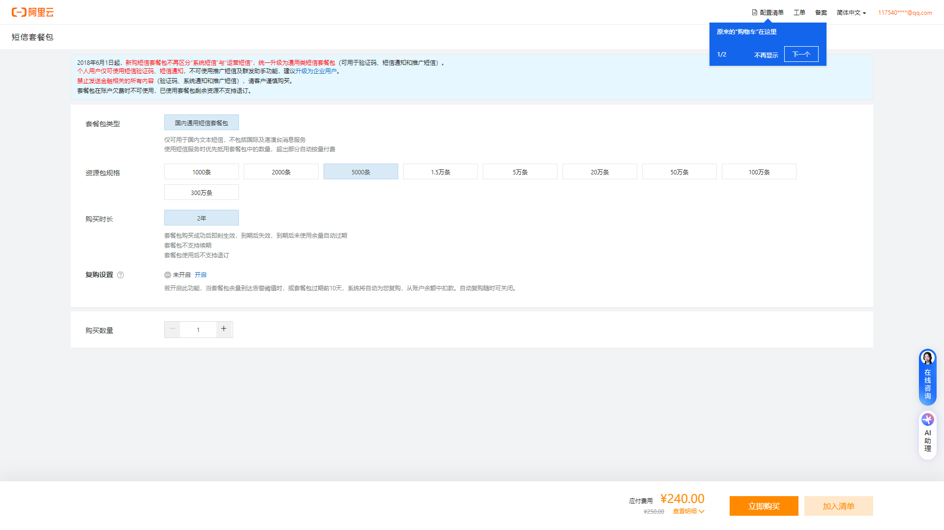 如果仅是短期内测试联调使用,官方建议优先购买 1000 条短信,以节省成本。